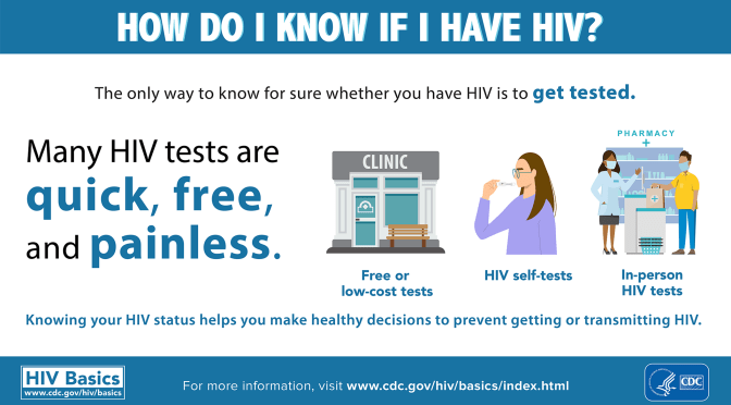 The only way to know if you have HIV is to get tested. Knowing your HIV status helps you make healthy decisions to prevent getting or transmitting HIV.